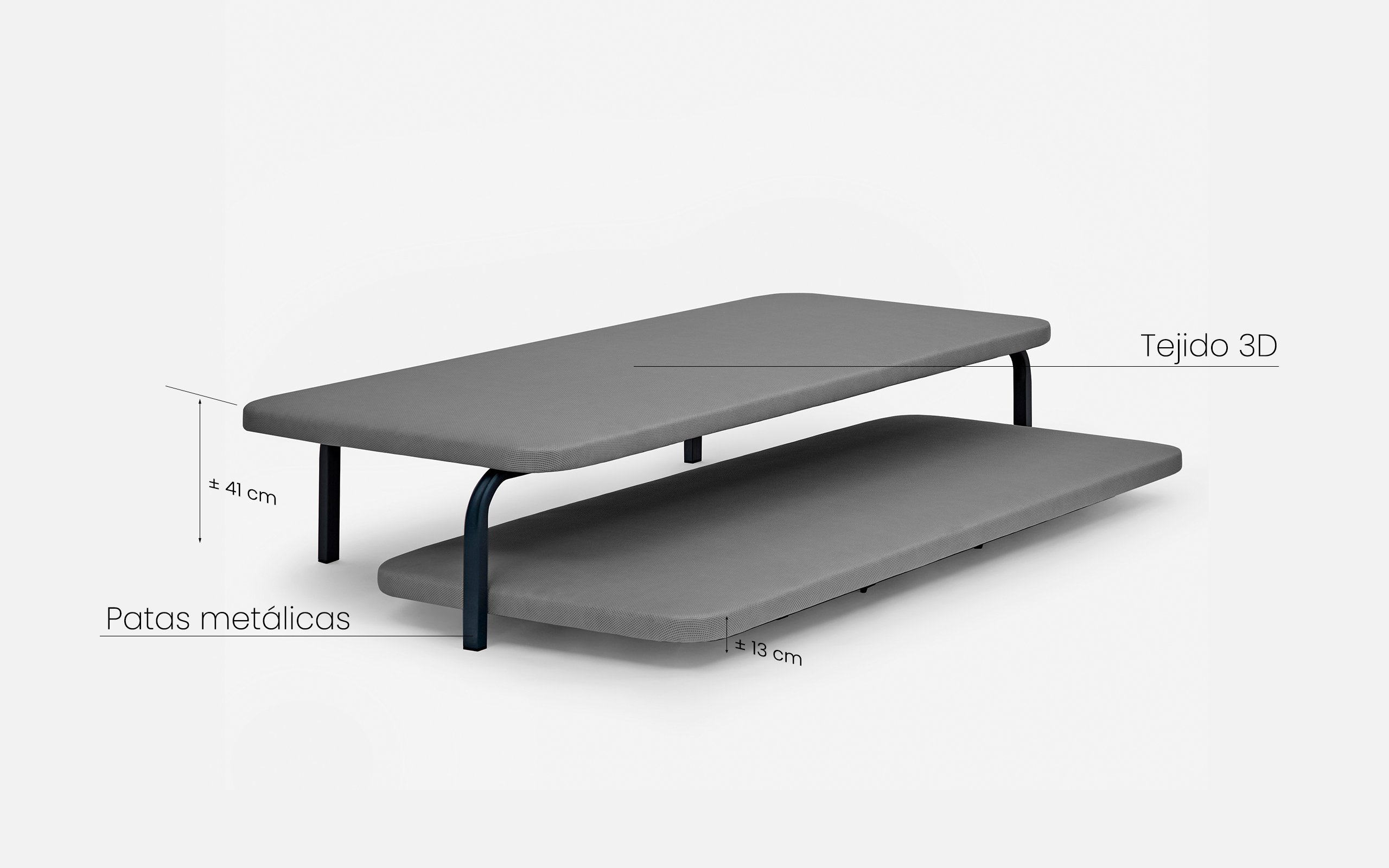 * Desplegada tiene la altura total de 41 cm, plegada 13 cm. El colchón que puede utilizarse para esta parte deberá ser de altura máxima 24 cm para que entre correctamente (sin ropa de cama).