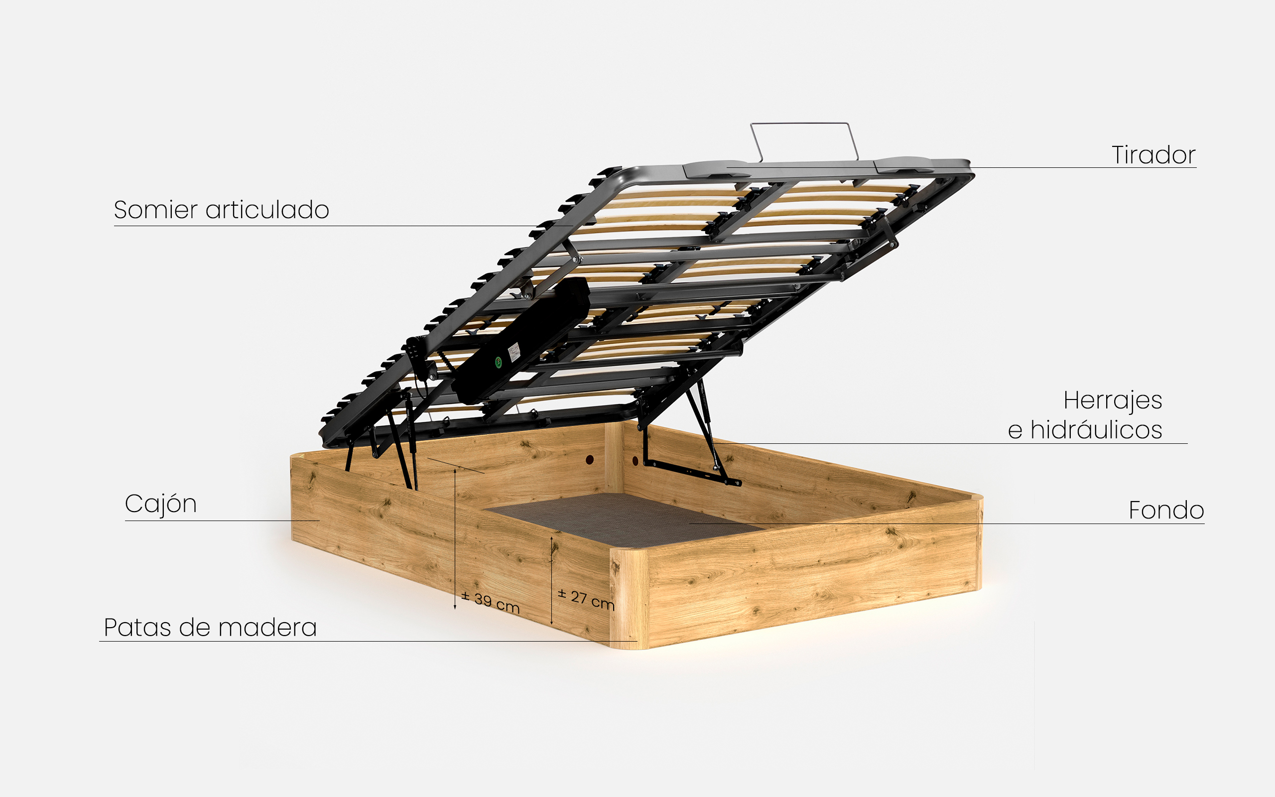 Tiradores en madera de la mejor calidad con una hendidura en la parte de abajo para hacerlo más ergonómico y sea mas fácil abrir y cerrar el canapé.